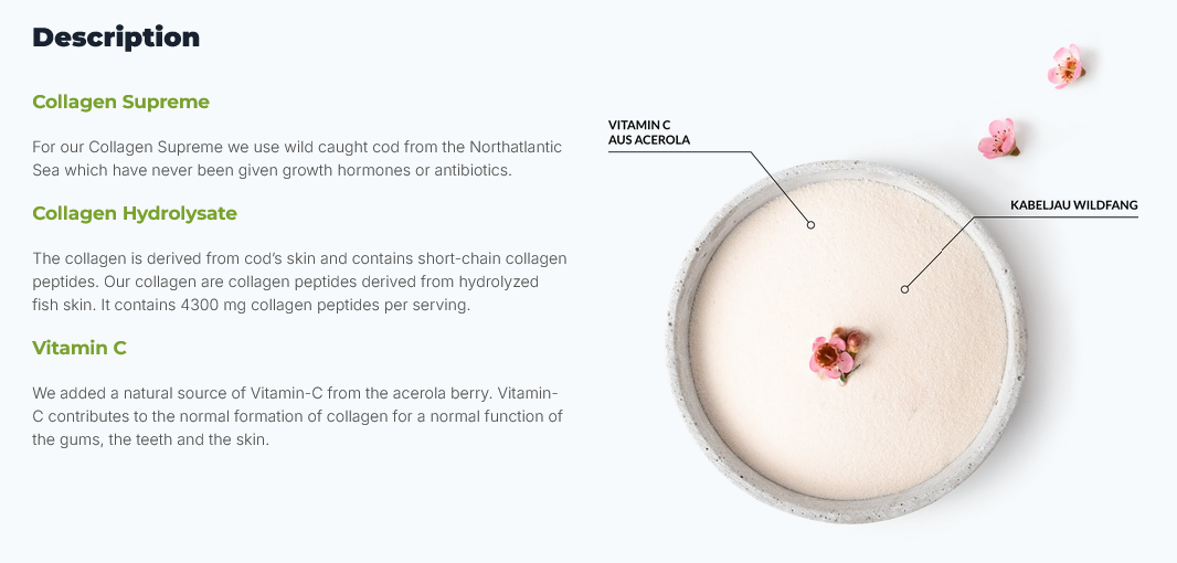 For our Collagen Supreme we use wild caught cod from the Northatlantic Sea which have never been given growth hormones or antibiotics.