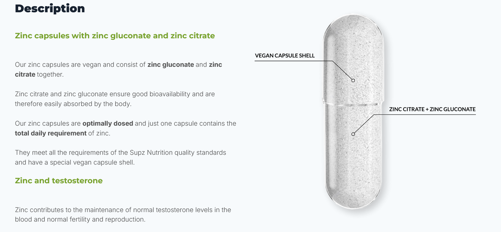 Our zinc capsules are optimally dosed and just one capsule contains the total daily requirement of zinc. They meet all the requirements of the Supz Nutrition quality standards and have a special vegan capsule shell.
