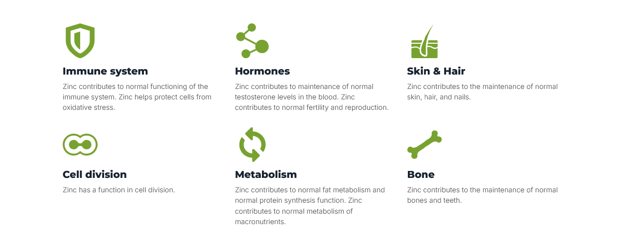 Zinc contributes to the maintenance of normal testosterone levels in the blood and normal fertility and reproduction.