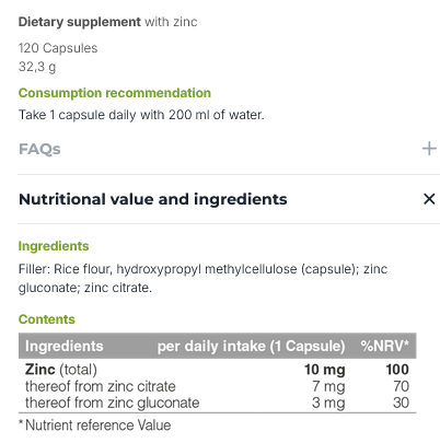 Zinc citrate and zinc gluconate ensure good bioavailability and are therefore easily absorbed by the body.